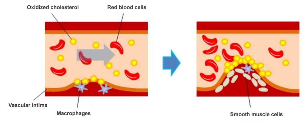 Arteriosclerosis (atherosclerosis) is a pathological condition caused by lifestyle-related diseases and is strongly correlated with various other illnesses. The process of arteriosclerosis begins when cholesterol, including oxidized cholesterol (LDL), enters the vascular intima from the blood. Immune cells in the vascular intima, such as macrophages and T cells, recognize the LDL as a foreign substance and ingest it, releasing cytokines and other substances. When smooth muscle cells are stimulated by cytokines and other substances produced by immune cells, they infiltrate and migrate into the vascular intima. This thickens the arterial wall, leading to the formation of blood clots and impaired blood flow.